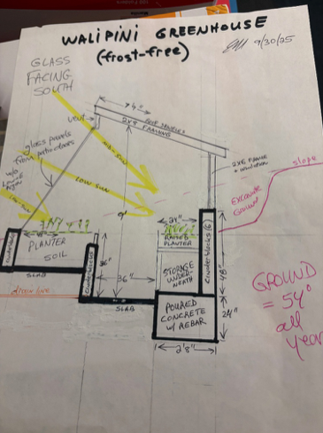Draft drawing of Walipini greenhouse, approx. 20 feet long x 10 feet wide
